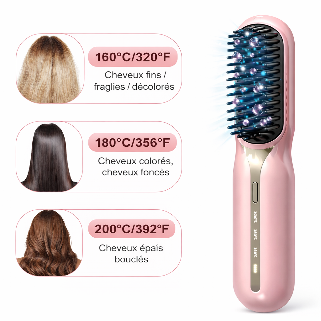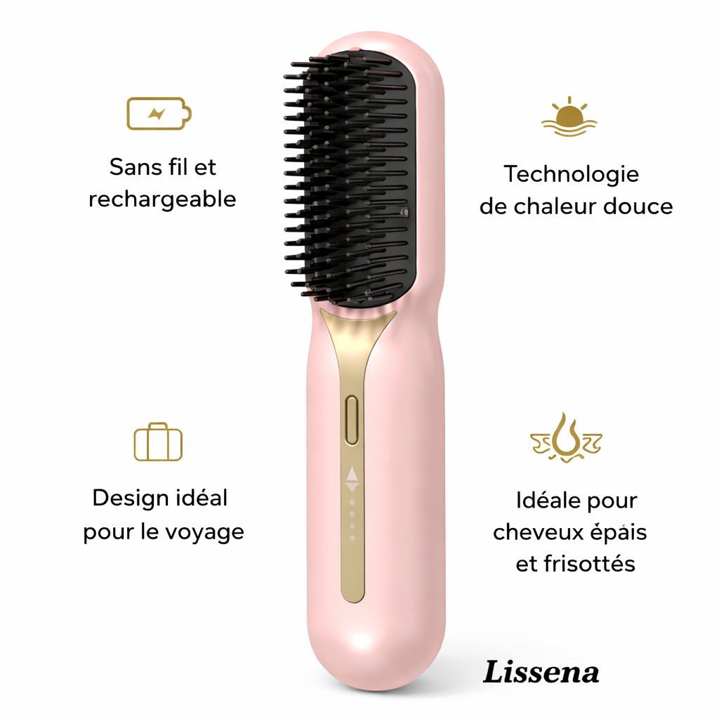La brosse LissenaHair associe technologie de lissage avancée, design sans fil et températures réglables pour un coiffage simple et rapide.